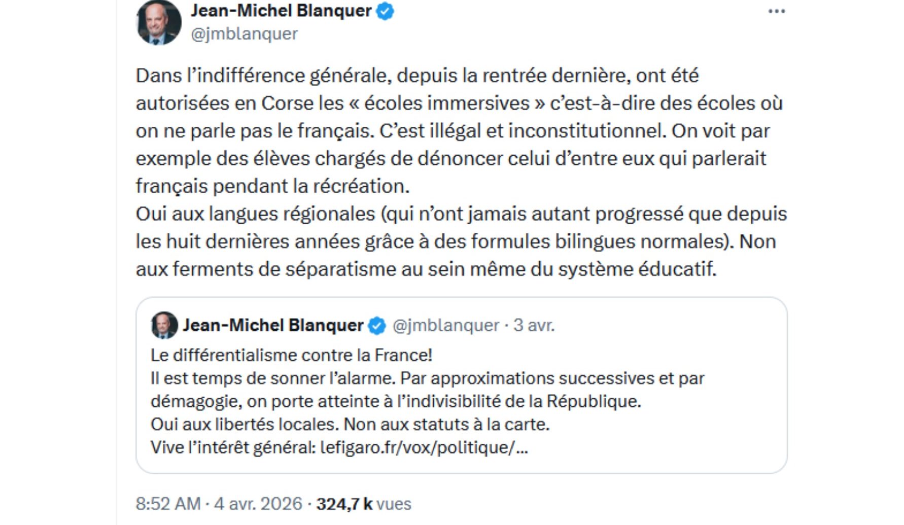 Le 4 avril dernier, l’ancien ministre de l’Éducation nationale Jean-Michel Blanquer a publié sur les réseaux sociaux un message mensonger et insultant concernant l’enseignement de la langue corse et le modèle immersif. La fédération d’associations Pour que vivent nos langues tient à réagir avec la plus grande fermeté à ces propos qui témoignent d’un mépris profond pour nos réalités territoriales.