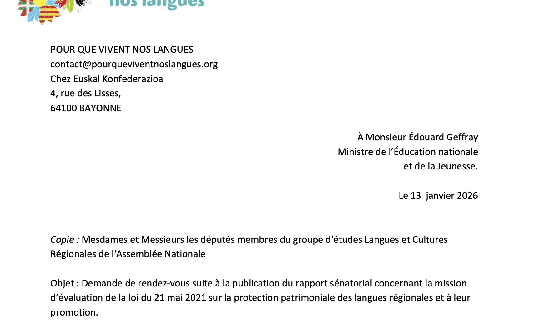 La nouvelle fédération d’associations « Pour que vivent nos Langues » a adressé au Ministre de l’Éducation Nationale, M. Edouard Geffray une demande de rendez-vous. Une copie de la lettre a été adressée aux député.e.s membres du groupe d’études Langues et Cultures Régionales de l’Assemblée Nationale.