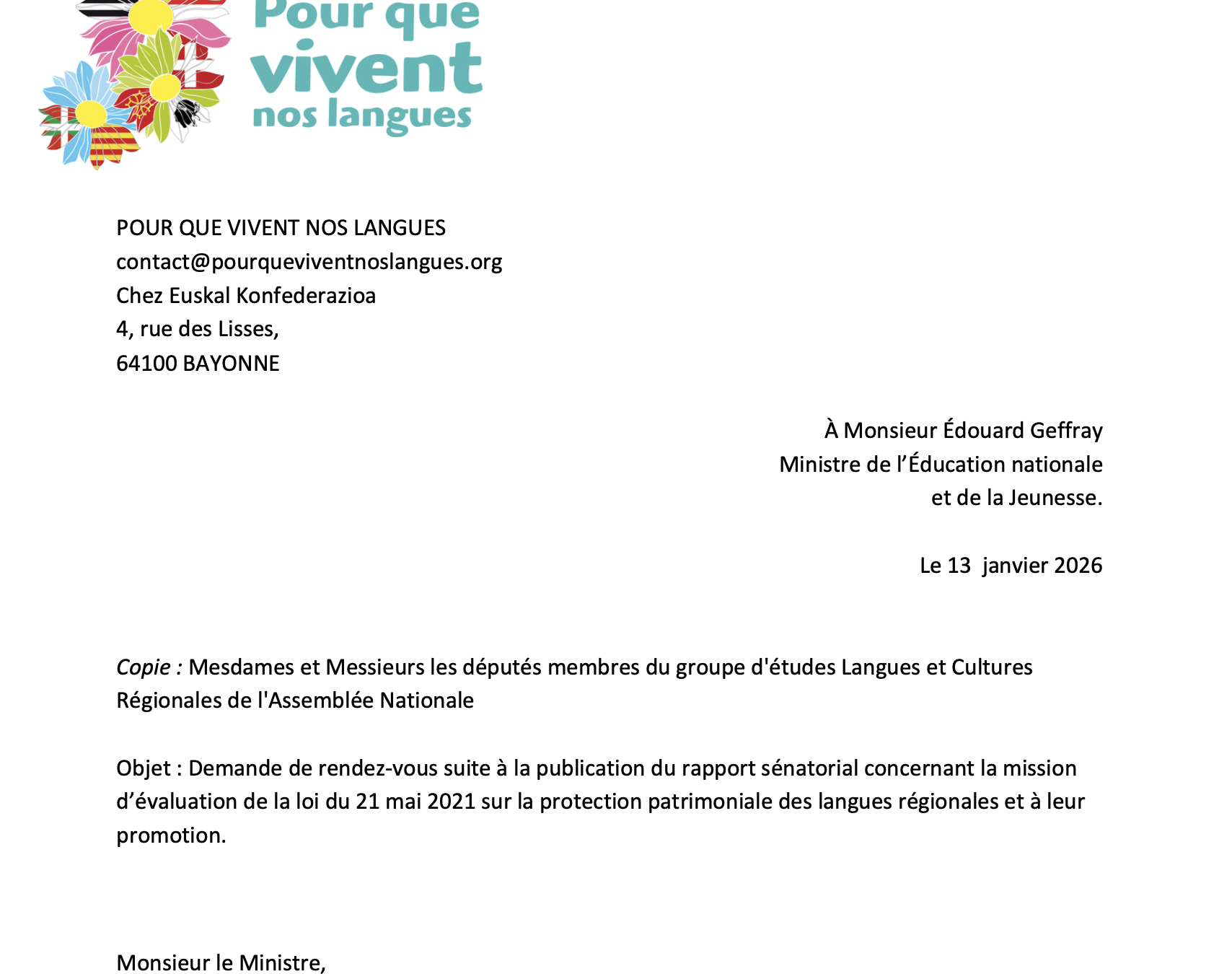 La nouvelle fédération d’associations « Pour que vivent nos Langues » a adressé au Ministre de l’Éducation Nationale, M. Edouard Geffray une demande de rendez-vous. Une copie […]